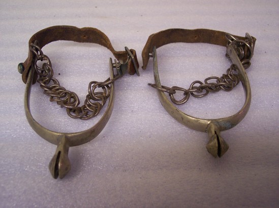 Pair of metal spurs. U shaped with knob at base of "U" Knob has slit at top. Open end of spur has button like protrusion on each arm. Attached to each button is a piece of leather with a metal buckle and a piece of interlocking round metal rings
