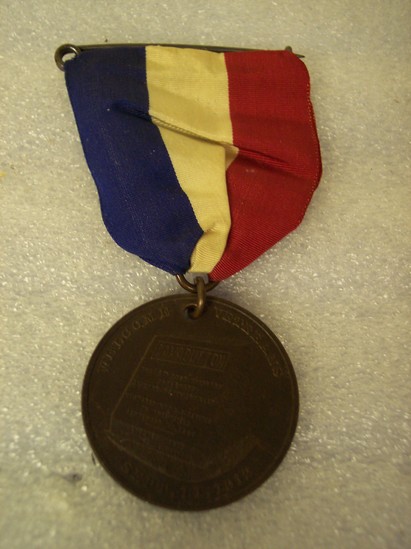 G.A.R. circular bronze medal with image of Camp Dutton memorial rock complete width its inscription, around outside of medal "Welcome Veterans / Sept. 11, 1912" suspended from a red,white and blue vertical striped silk grosgrain ribbon with pin atop.