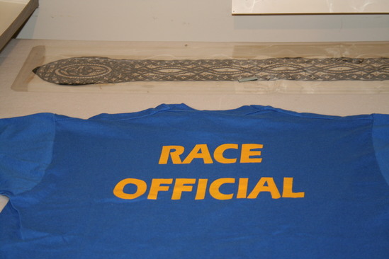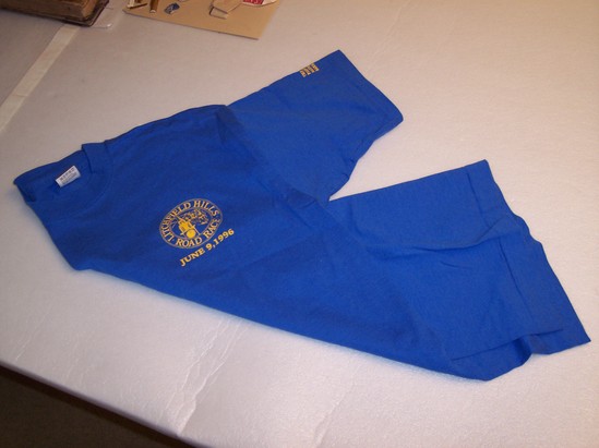 Royal blue T-shirt, short sleeved. On front, left hand side, logo for Litchfield Hills Road Race - circle with Congregational Church steeple and figures running. Date "June 9, 1996" printed under logo. Logo and date yellow in color. On back of shirt printed in large block yellow letters "Race Official". On left hand sleeve "The First National Bank of Litchfield" printed in yellow letters.
