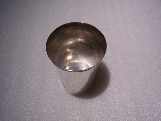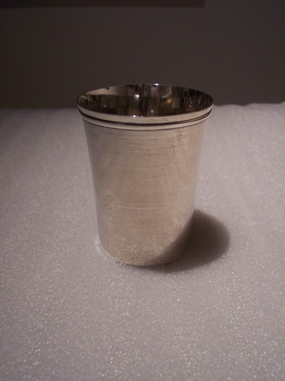 Silver cup, plain with no decoration or engraving. Has flaring sides with a molded band around top rim. Was received by the Congregational Church in the early 19th century and used during pastorate of Rev. Lyman Beecher. Was first silver communion piece given to church