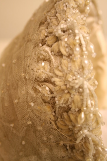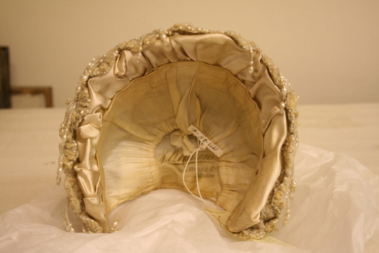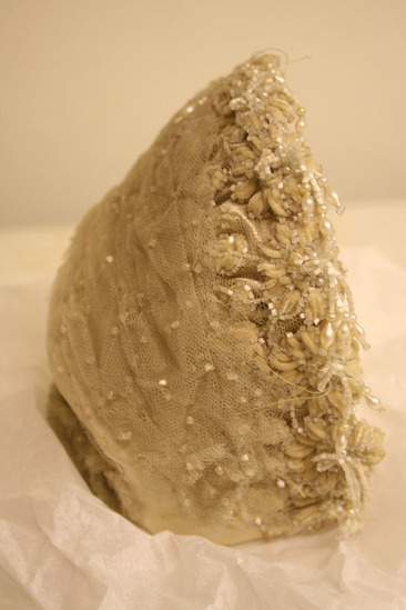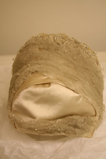 Short, half circular shaped hat; white silk, ruffled under brim; trimmed with beads and pipe cleaner like strands shaped as flowers; inch long strands of beads hanging from edge in front; top of hat covered in white netting with beads; label "J.W. Harrin/683 Broad St. Newark"