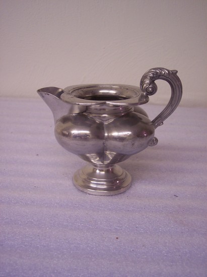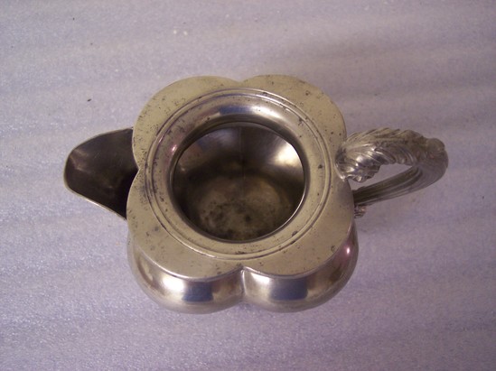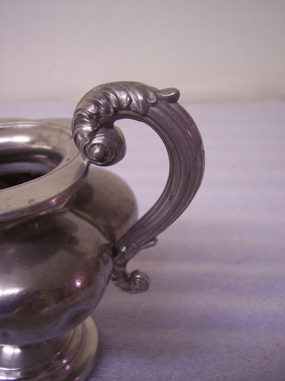 Dined stepped base, pideon breasted 4 lobed body, high flaring neck, round steeped lid, S & C cast pewter, S handle in floiage. Mark on bottom of creamer "James Dixon & Son"