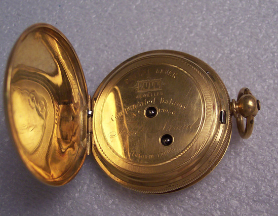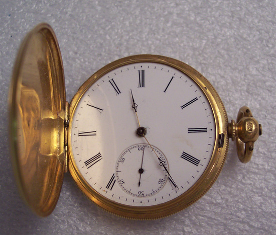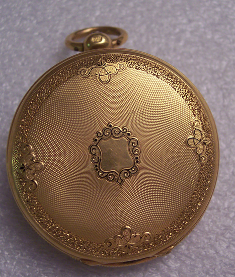 Stem with knob and loop, the top has a button divided in half each part operating a different cover. Front and back solid covers are engraved with floral border, spiral center and little ornaments in centers. Glass cover missing and white enamel face has Roman numerals, gold hands and a second dial. Watch belonged to Mrs. J. Deming Perkins Inside back cover marked "Ferron Freres 19936". On back under cover "Patent Lever/Full/Jewelled/Compensated Balance/No. 19936/Fredc Nicoud/Chaux-de-Fond." Inside front cover: "State Stamp of/Neuchatel/Carat 18 Gold/36"