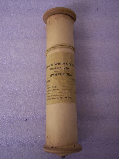 Wooden dowels with perforated paper rolls with hook on one end. Ends are button turned pieces with one end with hole and other end with wing nut shaped projection in metal. Each labeled "Wilcox & White Organ Co.,/Meriden, Conn. Symphonia" with roll number and selection listed with price. Roll 401 BOHEMIAN GIRL - Baife The heart bowed down I dreamt that I dwelt Then you'll remember me Chorus - Finale 80 (cents)