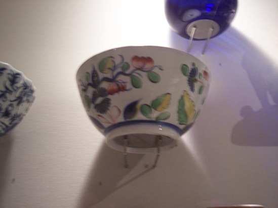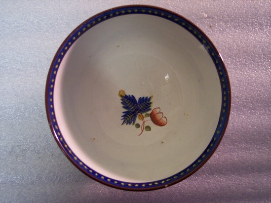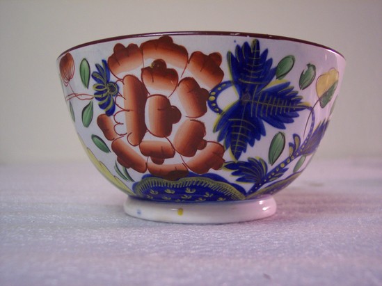 BOWLS WITH SLIGHT FOOT, ROUND CIRCLE UNDER GLAZE ON BOTTOM. EXTERIOR PAINTED IN LARGE "DUTCH GAUDY" OR "CALICO" FLOWERS ON SIDE--RED, GREEN, BLUE, AND YELLOW. BLUE LEAF AND FLOWER DESIGN IN BOTTOM OF BOWL. RIM BROWN WITH BAND OF BLUE WITH YELLOW FLOWERS.