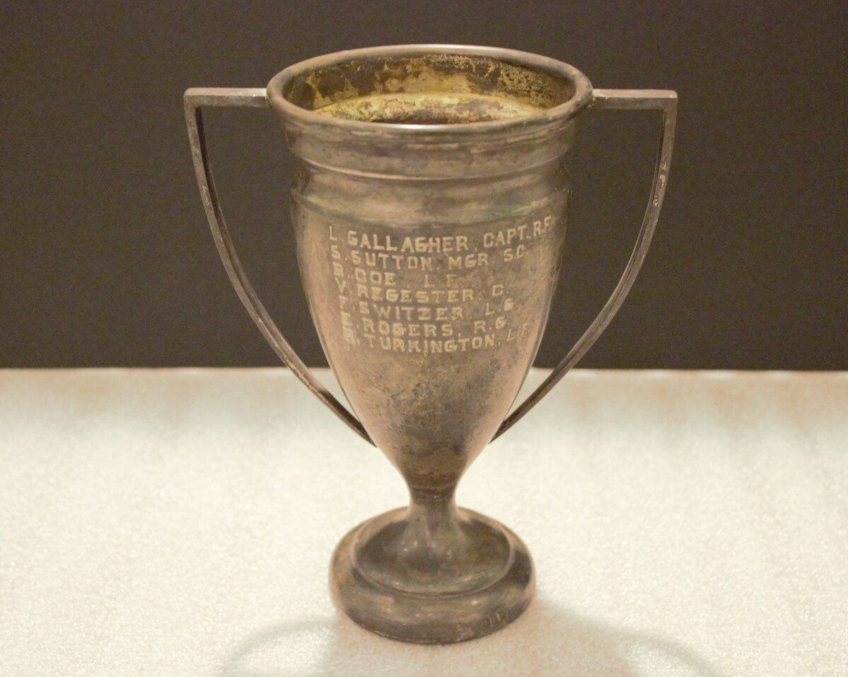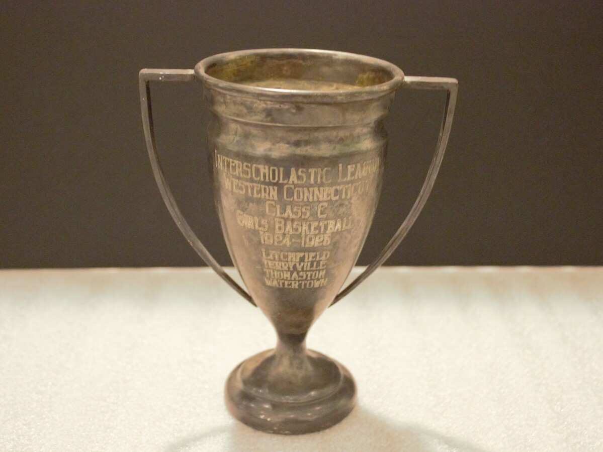 Metal goblet-style trophy for interscholastic girl's basketball, 1924-25. Engraved on front, "INTERSCHOLASTIC LEAGUE / WESTERN CONNECTICUT / CLASS C / GIRLS' BASKETBALL / 1924-1925 / LICHFIELD / TERRYVILLE / THOMASTON / WATERTOWN". Engraved on back, "L. GALLAGHER, CAPT. R.F / S. SUTTON, MGR. S.C. / B. COE, L.F. / V. REGESTER, C. / F. SWITZER, L.G. / E. ROGERS, R.G. / R. TURKINGTON, L.F."