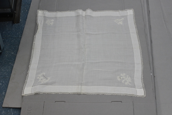 White cotton handkerchief. Large hem on all sides delineated on top by drawn work line. Scalloped lace border around outer edge. Embroidery work in each corner - one design is a giraffe with bridle tied to a tree. The other three are floral decorations. Written in the center on one floral embroidery in link "Henrietta Manning."