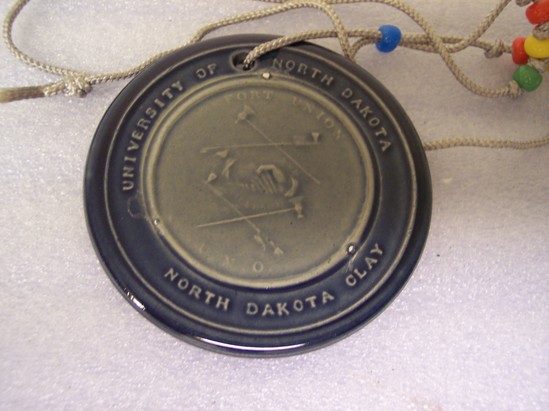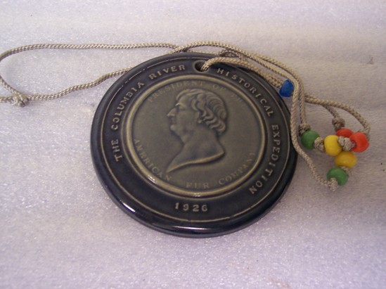 Earthenware medallion on long grey braided string with blue, orange, yellow and green glass beads. Medallion done in two tones of blue glazes. Front of medallion has profile portrait bust of a man, inscription reads "PRESIDENT OF THE AMERICAN FUR COMPANY" and "THE COLUMBIA RIVER HISTORICAL EXHIBITION 1926" On back side is a image of Fort Union at top and bottom with crossed Indian hatchets about and below shaking hands. Inscription around the edge reads "UNIVERSITY OF NORTH DAKOTA NORTH DAKOTA CLAY"