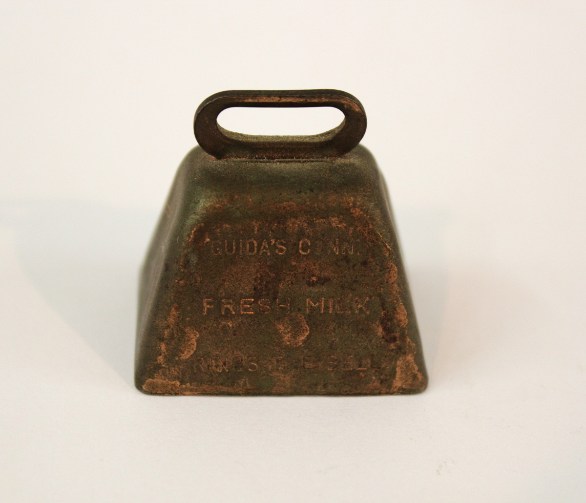 Souvenir miniature cowbell produced for Guida's Dairy, New Britain, Conn. Copper cowbell with narrow handle at top with round copper clapper. Engraved on front, "GUIDA'S CONN./ FRESH MILK/ RINGS THE BELL". Likely used as a promotional item tied to milk bottles.