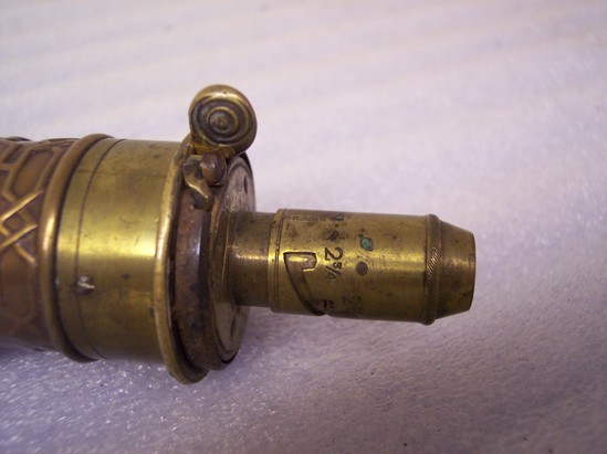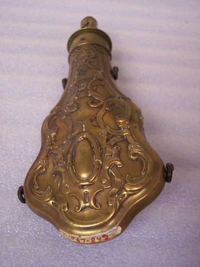 Crest motif on body of flask with strap work in repousse. Copper body with 2 rings of brass on either side, round brass top with spout marked "Drams/ 2 3/4 / 2 1/2 / 2 1/4 / 2"with adjustable coppar of brass. Iron spring and brass knob cast in concentric circles. Pear shaped body. Marked on flask "G & J W HAWKSLEY, Sheffield"