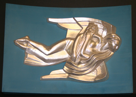 Aluminum bas relief depicting a winged woman holding grain (Virgo). The aluminum relief is mounted on a wooden base painted teal.