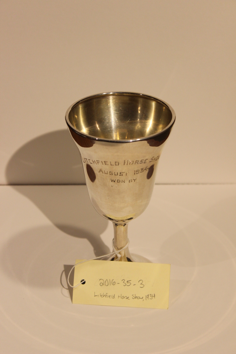 Sterling silver goblet-style trophy awarded for individual class competition at the Litchfield Horse Show in 1934. Engraved on front "LITCHFIELD HORSE SHOW/AUGUST 1934/WON BY." Engraved on bottom "STERLING" with unidentifiable hallmark.