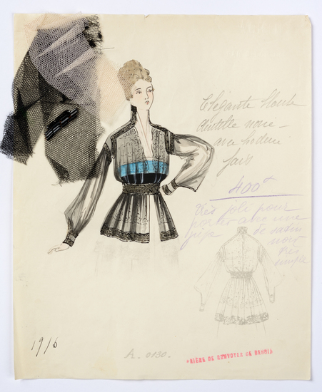 Lithograph and watercolor on paper fashion design. Black lace blouse with embroidery. Fabric samples accompany rendering.