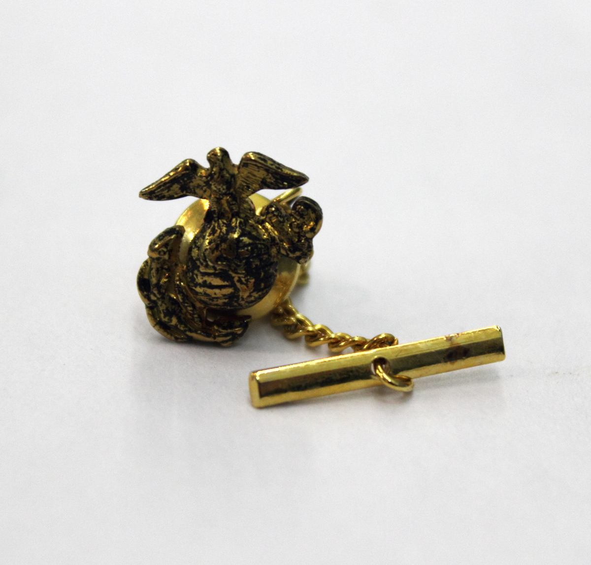 Brass and bronze USMC tie tack, possibly World War II era. Design is bronze USMC insignia, attached to brass fastener. Attached to fastener is a chain that leads up to a rectangular bar.