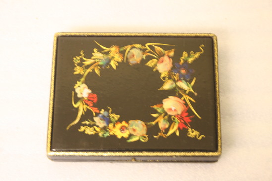 Leather bound case, jappened black with gold trim, satin back in a papier mache panel - circle of flowers, gilt and painted with mother of pearl inlay. Front panel of voals of red and gold surrounding an oval of a dog with bird in mouth in landscape scene. Push knob on side. Lined with blue velvet.