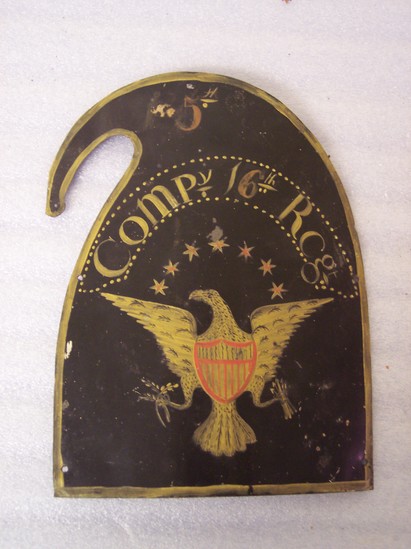 Piece of tin cut in shape of liberty cap. Japanned and painted with yellow borders. American spread eagle and seven stars over its head. Eagle has red shield on breast and stars have red stars over yellow ones. "5th/Compy 16th Regt"