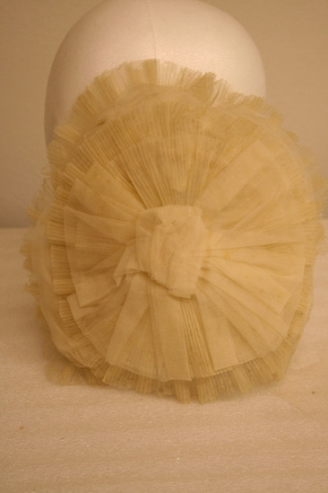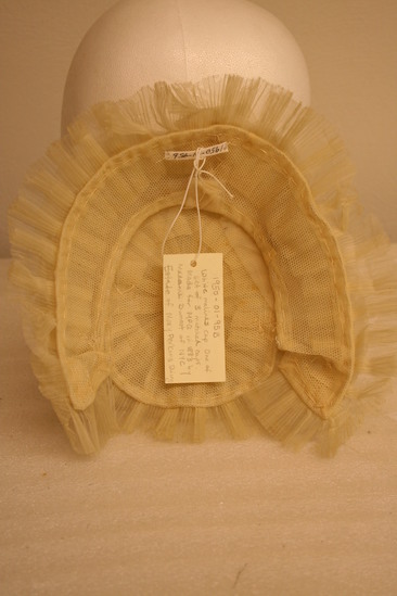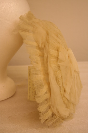 Shallow and oval shaped cap; white net base covered in crimped white cloth in layers in circular pattern; white bow in cneter of hat; second layer ruffled white cloth; label "Made by Madame Dumest, successor to Madame Larmande 10 E 22nd St. New York"