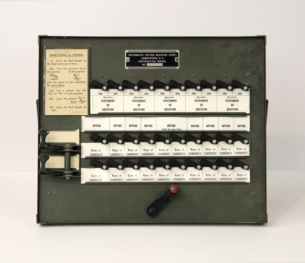 Instruction model for an election voting machine, commonly referred to as a lever machine. Rectangular, heavy, metal frame with olive drab coloring. Thin metal lip around front, flat on back. Attached on front are three rows of black levers with raised silver points; two larger black levers (party levers) attached to the left of the lower two rows; one single black lever attached at bottom-center, with red handle (record and reset lever). Inserted at top-left is an instruction card. Four paper strips inserted between the horizontal levers (from top: ballot questions, names of offices, candidates from each part). Metal plaque attached at top, with silver text "AUTOMATIC VOTING MACHINE CORP./JAMESTOWN, N.Y./INSTRUCTION MODEL/NO. 25395" on black background. Metal arm attached to frame to serve as a stand.