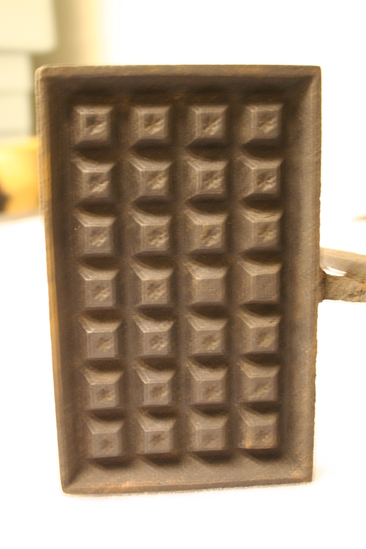 Long handled round shaft with closing knob and wire loop. Arrow joint to pan; hinged; grid pattern waffle iron; square