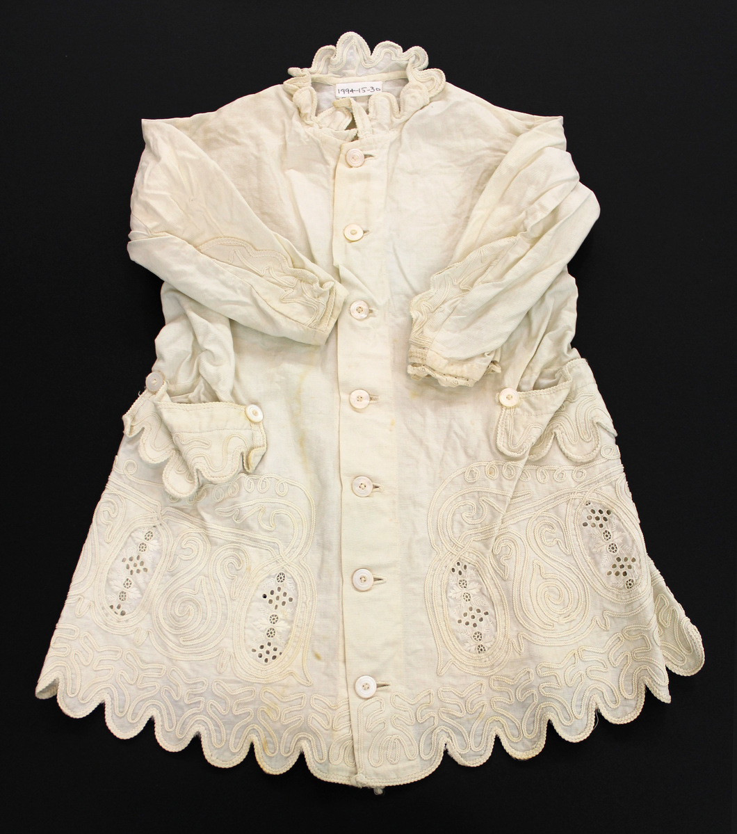 White ribbed cotton child's coat; A-line; open down center front with seven large buttons; round neck with ruffled collar; long sleeves with lace ruffle and flange; trimmed with cording work; decorative pattern along lower half with scalloped bottom edge; two pockets in front with cording work and buttons; center back opening with three buttons; machine and hand stitched