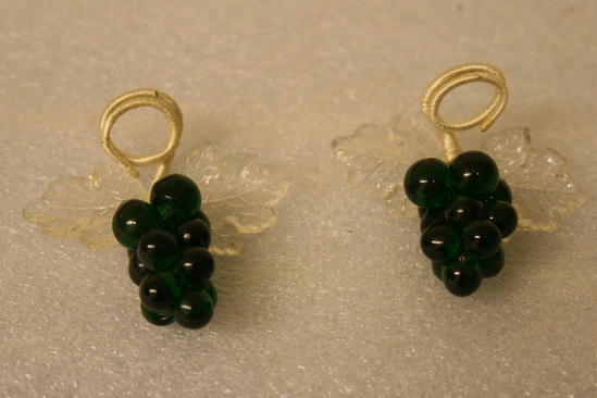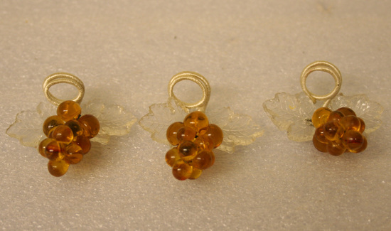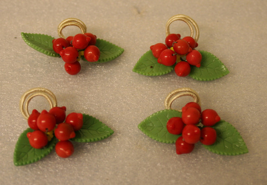 A-D - 4 place card holders - cluster of red berries with two green leaves, brightly colored plastic. Pieces held together with wire. Coil of wire at back wrapped in white silk for name card to be placed. E-G - 3 place card holders, golden glass grapes with clear glass leaves, same coil of wire with white silk at back. H-I - Same as above except grapes are green glass J-K - 2 place card holders, cluster of ceramic oranges with green plastic leaves, coil of silk covered wire at back.