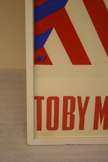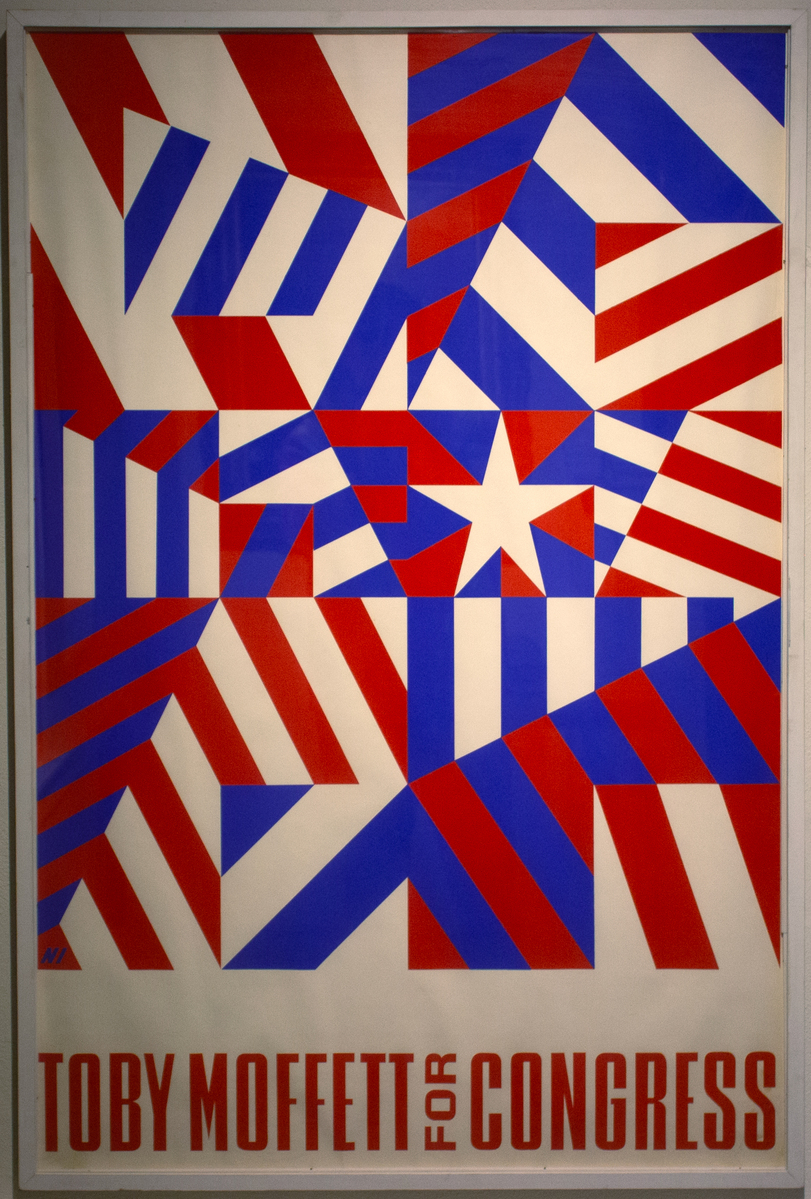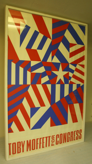 Political poster - white background. Series of red, white and blue lines set at various angles creating a chaotic series of stripes and lines. White star slightly off set of center. Red lettering at bottom "Toby Moffett for Congress" Signed "NI" in bottom left hand corner. Framed under glass with simple wooden white frame.
