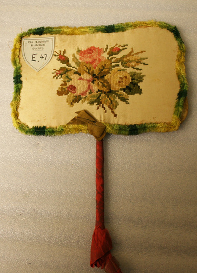 Hand screen or fan. Metal or wooden frame. Screen has rectangular shape. Covered in white silk with border of green and brown fringe. Floral design in counted cross stitch on front of screen. Rigid handle extending from bottom center of screen. Wrapped in red/pink silk ribbon. Olive/brown colored bow at top of handle.
