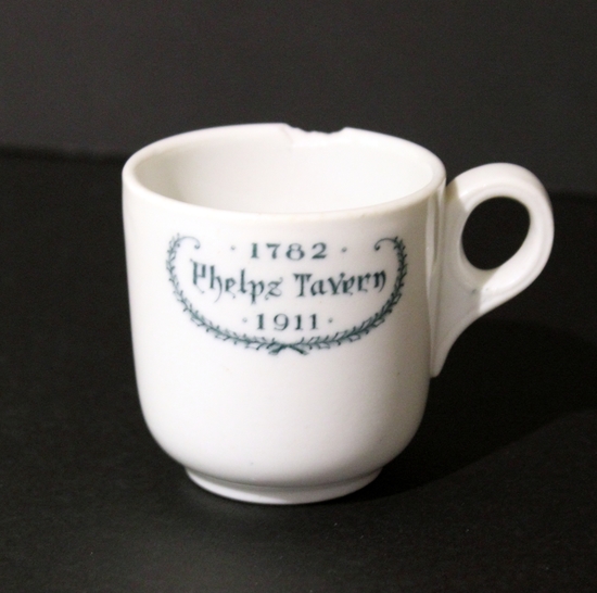 Small white cup with single-bend handle. Cup marked with transfer print under glaze in green on one side that reads, "1782/ Phelps Tavern/ 1911." Words surrounded by a green garland.