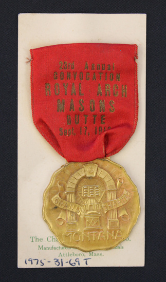 Gold Masonic medal. Red silk ribbon with "23rd Annual / CONVOCATION / ROYAL ARCH / MASONS / BUTTE / Sept. 17, 1912" stamped in gold on ribbon. Round gold pendant hanging below ribbon. Cast decorated with Masonic symbols. "GRAND CHAPTER / MONTANA" stamped on front. Reverse side of pendant stamped "ROBBINS CO / ATTLEBORO / MASS." Medal pinned on stiff, cream colored card stock printed with "The Charles M. Robbins Co. / Manufacturers of Badges and Medals / Attleboro, Mass." in green across bottom.