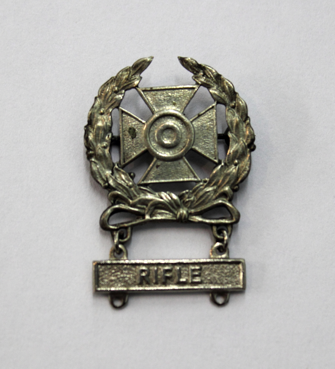 Army Expert Rifle Qualification badge, World War II era. Silver-colored metal badge with pin attached to back and rectangular plate hanging below. Rectangular plate has raised lettering in center "RIFLE". Main badge depicts target overlaid on a cross pattée, which is surrounded by a laurel wreath which is tied at the bottom by a bow.