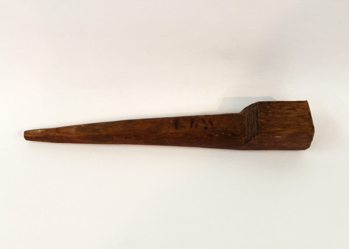 Carved wooden peg or spike. Flat bottom, with slightly rounded sides and squared head. Head protrudes in one direction, and has wear around the top; shaft tapers to a flattened point. In carved letters on shaft, "LBW".