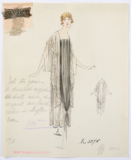 Lithograph and watercolor on paper fashion design. Tea gown in silver lace with black and silver tulle over rose. Satin and chiffon. Fabric samples accompany rendering.