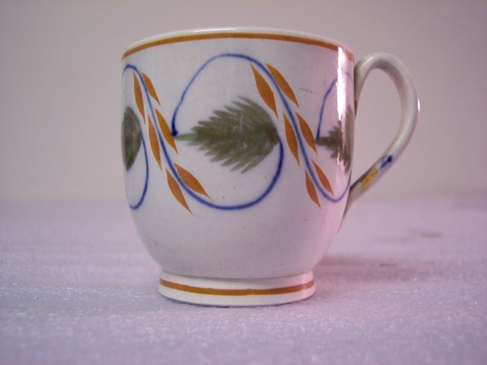 High ring base with yellow glazed line, egg-shaped body with yellow line just inside and outside of the rim. Blue line and yellow leaf spiral chain on body with green oak leaf connections. High, ear handle with blue YYY lines down outside.