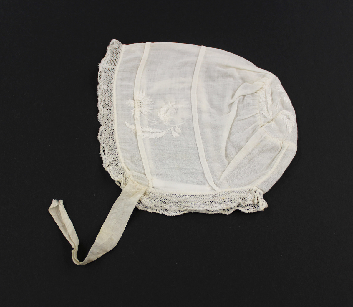 Off-white sheer cotton child's bonnet; tucks and floral embroidery; lace at front and neck; circular section in back; off-white silk ties (one missing)