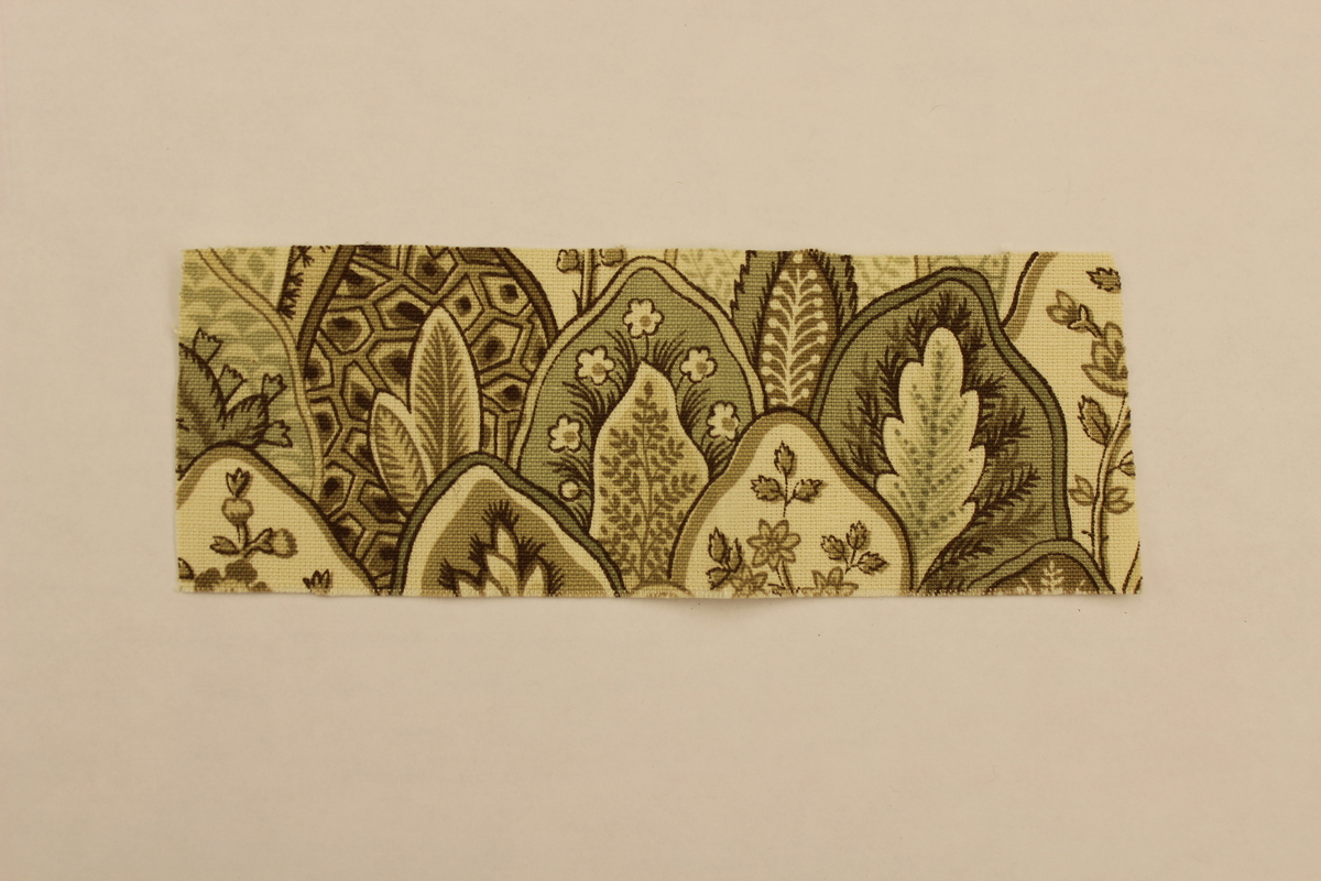 Rectangular fabric swatch made of synthetic material. Fabric is white with a light brown and green tree pattern. Surrounding each tree is a mis-shapen teardrop shape in either green or brown. The teardrops are filled with miscellaneous patterns or a solid color. Fabric has a fairly open weave and is rough to the touch. Style number is 170008.00. Marks: Tag attached with manufacturer name and sample information