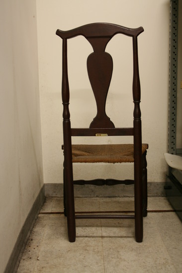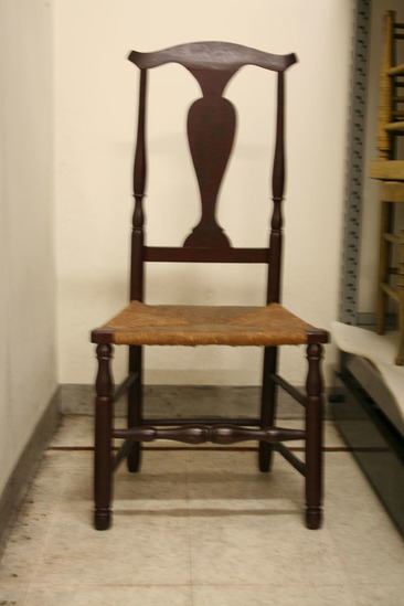 Fiddleback side chair with rush seat. Round front legs, slightly turned. Turned front stretcher - tulip and hollow ring pattern. Pair of stretchers on side and one in back - all plain. Flare earred yoke, vase shaped back splat. Simple turned side rails. Chairs painted/grained like mahogany. One of a seat of three.