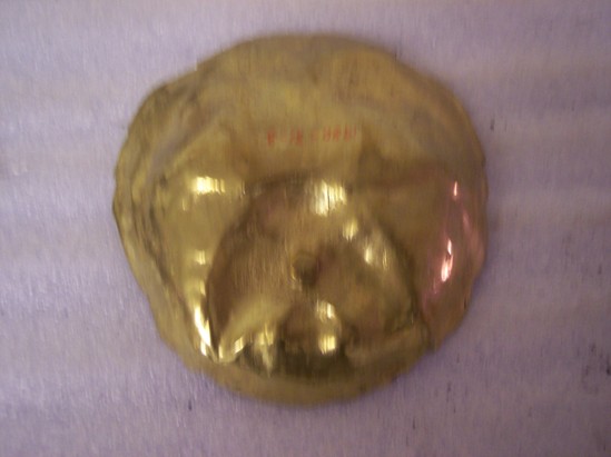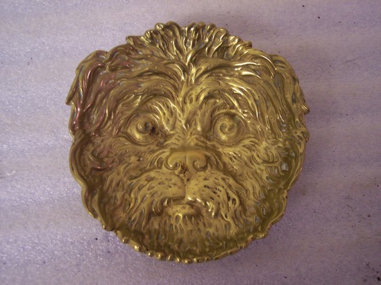 Concave dish formed from heavy brass cast in life like semblence of a hairy or shaggy type dog's face. Short cylinder on bottom to make it stand solidly, no detail on back.