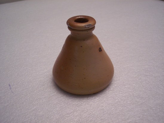 Small stoneware bud vase, tan glaze on exterior. Ridged lip