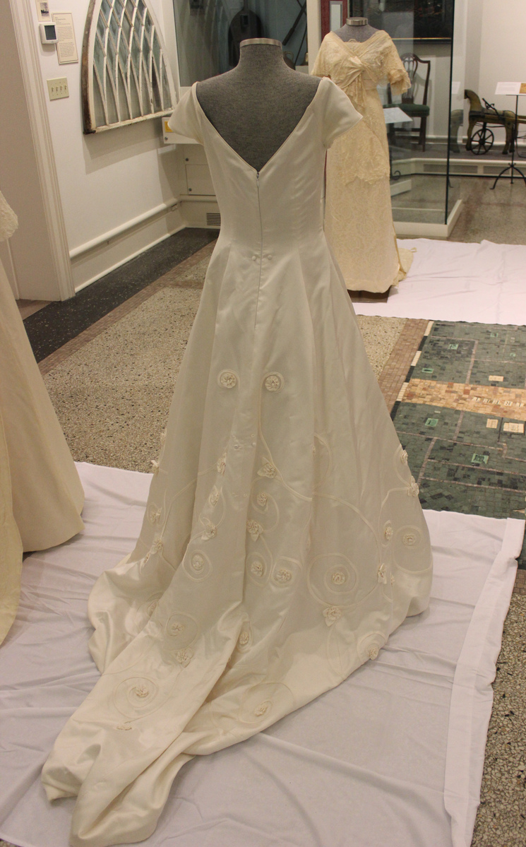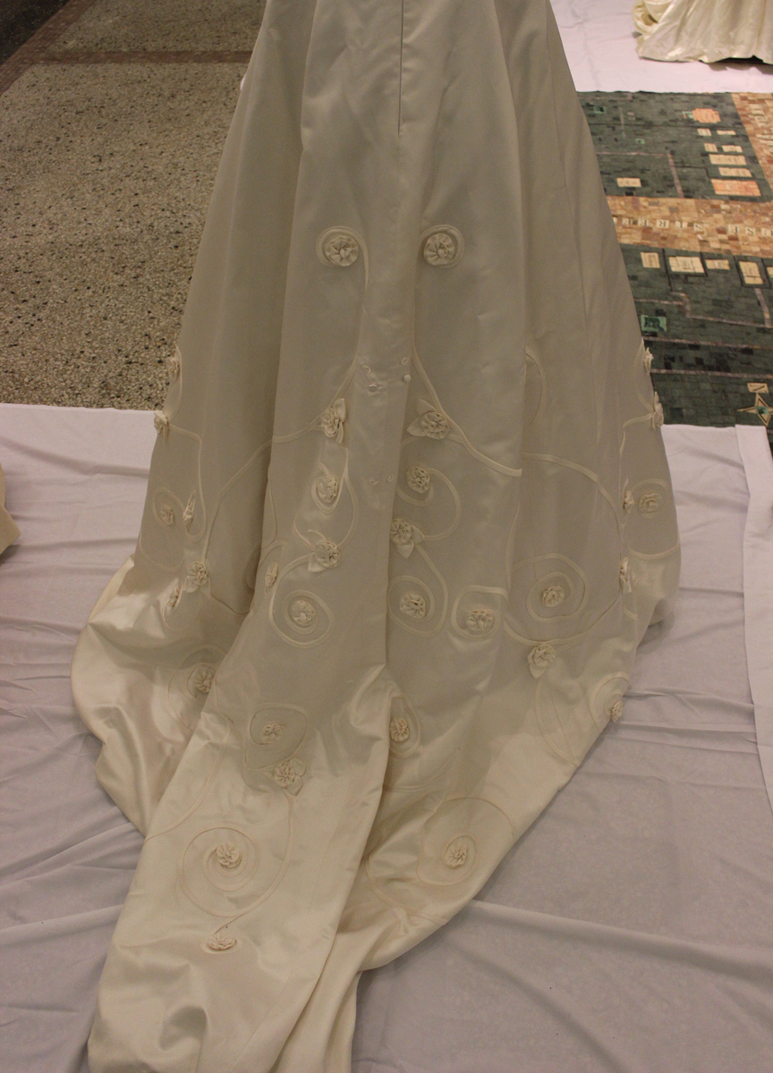 White satin off the shoulder A-line wedding dress. Short sleeves and fitted waist. Appliqued curvilinear design with small gathered flowers on skirt. Piping along neckline. Train at back. Double lined. Taffeta and net interior petticoats. Center back zipper with with hook and loops. Two small covered buttons at waist at center back. Horsehair braid at hem. Labels at center back: Tomasina, size 8; care instructions. 83" length. White net veil with satin ribbon edges. Matching small flowers at top. Comb at top inside. 41" length.