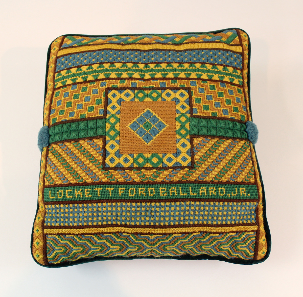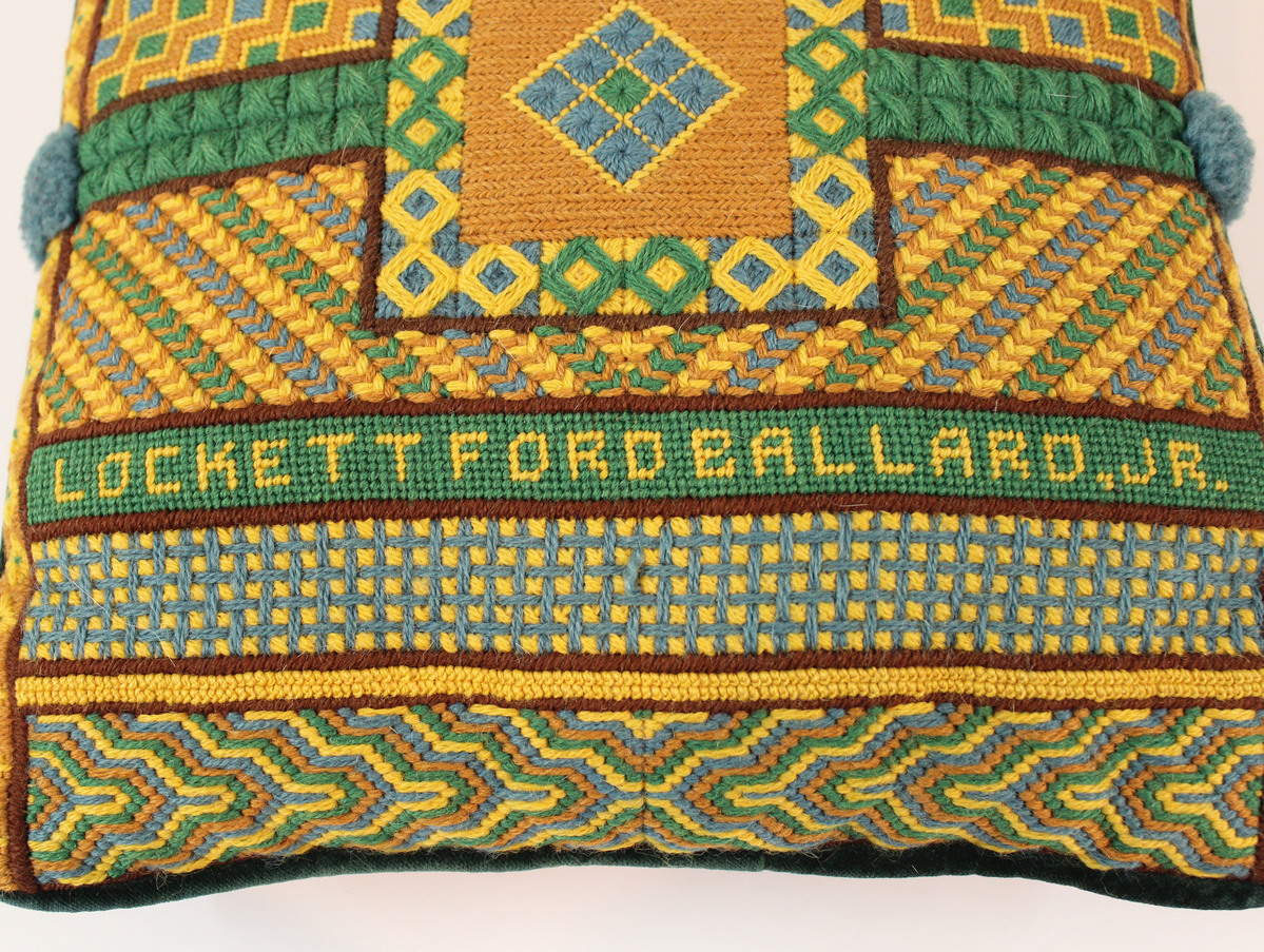 Square pillow with needlework embroidery face. Horizontal bands with distinct geometric patterns, done in green, blue, tan, yellow, and brown threads. At center, square shape with geometric border and diamond shape set in square of tan thread. Narrow vertical bands with the same geometric design run along left and right edges of pillow face. All bands and elements are separated by thin lines of brown embroidery. In yellow embroidered text set on green band, "LOCKETT FORD BALLARD, JR." Reverse of pillow done in green velvet, with zipper at middle. Various stitching techniques demonstrated.