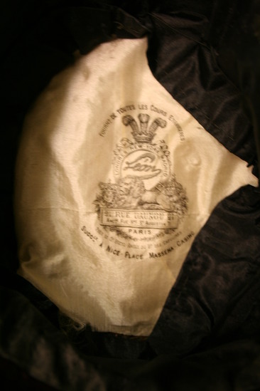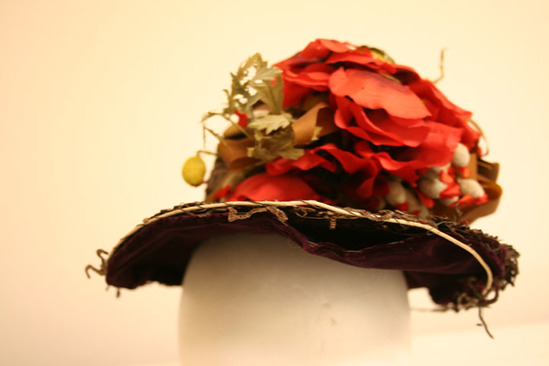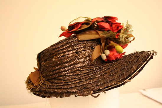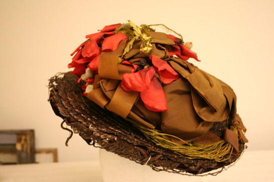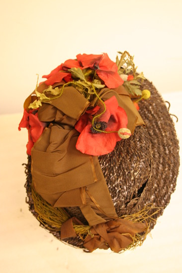 Brown straw hat with long, visor like brim in front and no brim in back; underside of brim lined with purple velvet; right side of crown (from front) decorated red, poppy like cloth flowers, green leaves, small grey buds; brown bow covering from flowers to back; green grass twisted around base of crown on back right side; small brown bow in back; label "Fourner De Toutes Les Cours Esangeres/Leon/21 Rue Daunou/Paris"