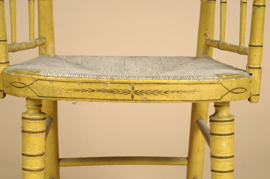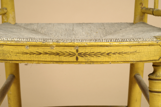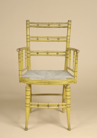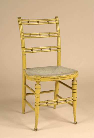 Maple seating furniture with rush seats. Painted yellow, simulated bamboo, with gilt and black decoration. Free hand decoration in gold on seat rail. Back 3 rows of 3 rails with gilt balls at turnings. Vase shaped tapered front leg ending in button foot. Back legs simple tapered round stretcher in front as back. Two simple stretchers at sides and single in back. Rush bottom for seat painted white. A: settee, B-C are arm chairs; D-M are side chairs. A set of 18 chairs were made by Silas Cheney for Tapping Reeve, July 16, 1815 See also 1976-03-1/6