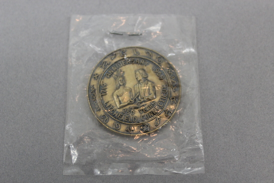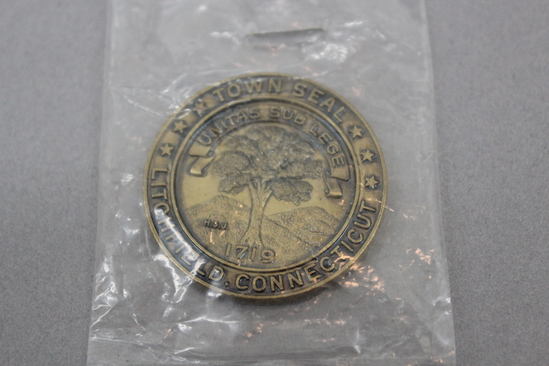 Commemorative coin commissioned for the 250th anniversary of the incorporation of the town of Litchfield, CT. On one side is an image of a Native American and European settler, with the text "1719/Anniversary/1969/Litchfield, Connecticut/250 Years/B.W.C.H.S.J." On the reverse is the town seal of Litchfield, featuring a large tree and the text "Town Seal/Litchfield, Connecticut/Unitas Sub Lege/1719/H.S.J."