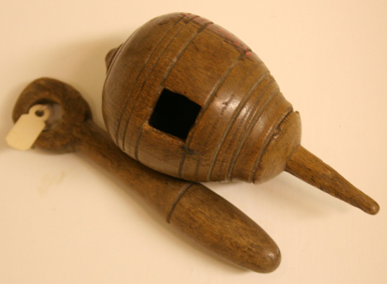A - Spinning top made of maple wood. Small, gourd shaped, hollow with square hole on side. The top fits like a cover and has a pointed shaft on one end which string was wound. Incised lines around body of top. B - Spinning top handle, shaped piece of maple wood, rounded head with a hole through middle, neck narrows under head but widens slightly towards bottom which is rounded. Incised line around middle of handle.