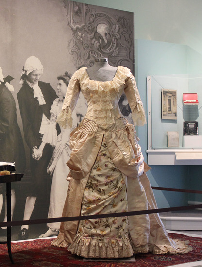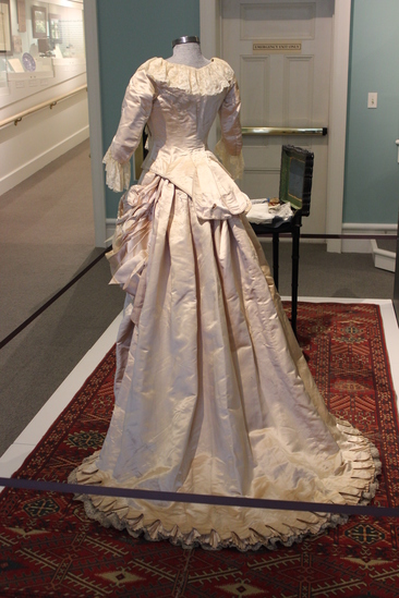 Bodice - Pink satin, scoop neck, 1/4 length sleeves with lace cuff, lace ruffle at neck, lace up front comes to a point, 2 square bottomed flaps at back, double cord filled edge at bottom; false front of pink silk with 5 lace layers one overlapping the other; steel snaps added Skirt - pink satin with silk ribbon white waistband with steel hook; 2 side bustles pleated and swagged; front panel of multi-colored flowers painted on white silk ending in triangular flaps; white lace ruffle over 2 pleated overlapping ruffle of main material; back gathered at waist falling in train ending in triangular panels over pleated satin band over double layer of lace; net lined; large satin bows at joint of bustle and back panel