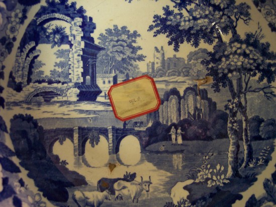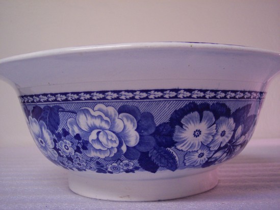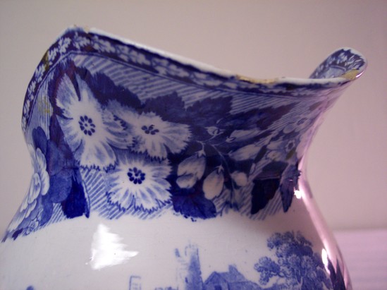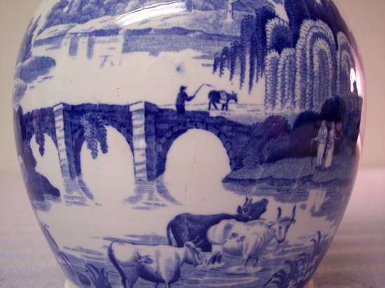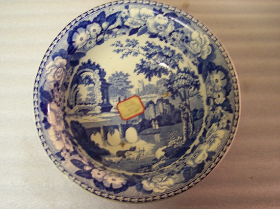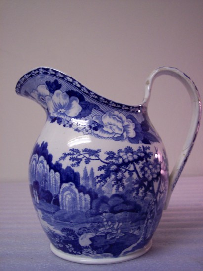 Spode or Staffordshire, blue and white transfer print pitcher (B) and basin (A), high basin with flared rim on high foot, blue floral border around outside, inside with scene of castle ruins, aqueduct, man and woman under weeping willows, three cows in center foreground. Pitcher with bulbous body, C- curve handle, with same scene around body and floral border around rim.