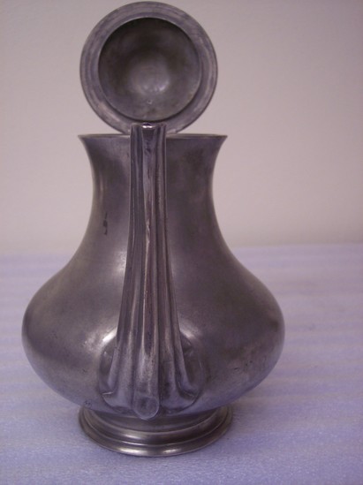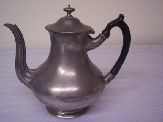 Round stepped base, smooth bulbous body, fluted S-spout. Wooden, black painted ear-shaped handle. Shallow Domed lid with button finial with dot knob on top.