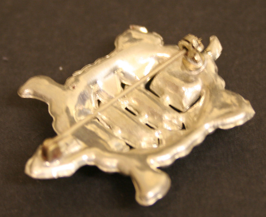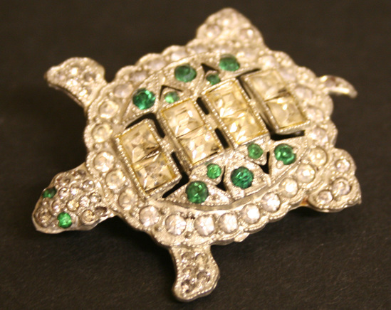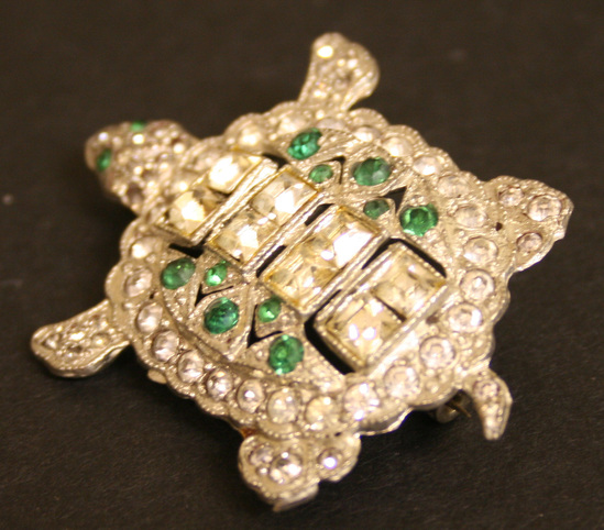 Turtle-shaped brooch set in silver metal setting with diamond and emerald like stones; straight pin at back