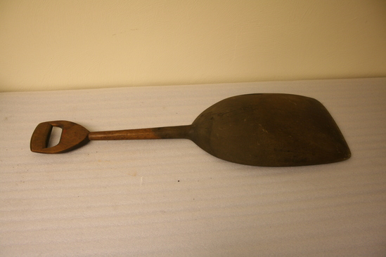 Large wooden shovel, scoop base wide and deep with round shaft and U handle with cross piece at top. Carved from one piece of wood