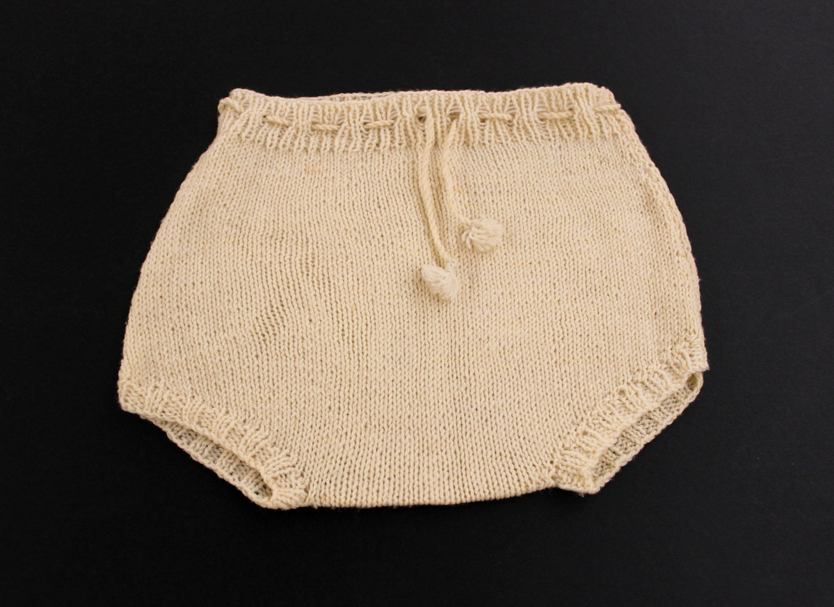 Off-white wool hand-knit children's shorts. Stockinette stitch with ribbing at waist and leg openings. Drawstring with fringe at waist for fit. Worn over diapers, called a "soaker."